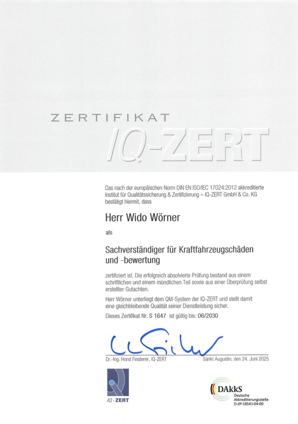 Vom Institut für Qualitätssicherung & Zertifizierung GmbH & Co. KG (IQ-Zert - DAkkS akkreditiert) zertifizierter Sachverständiger für Kfz-Schäden und -Bewertung.