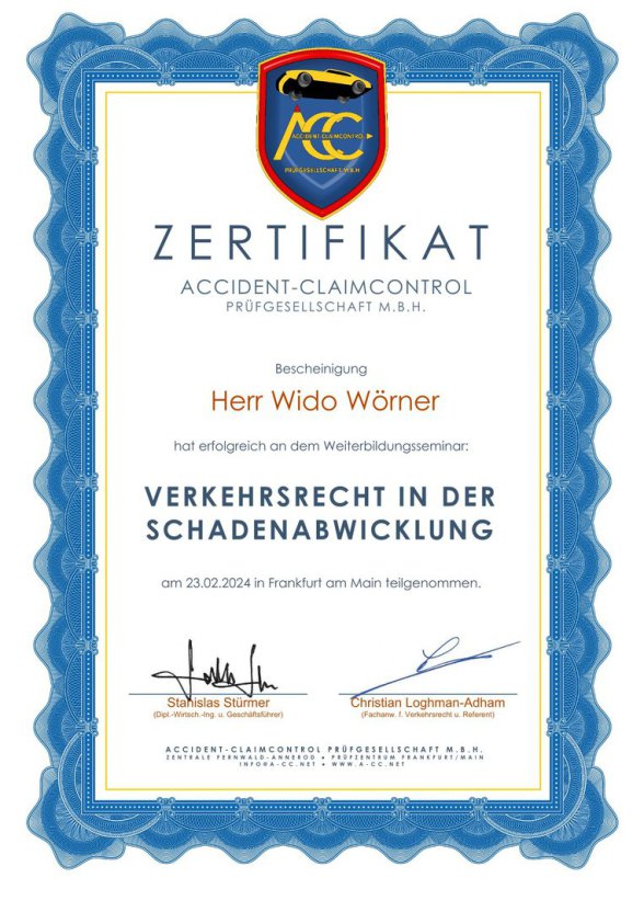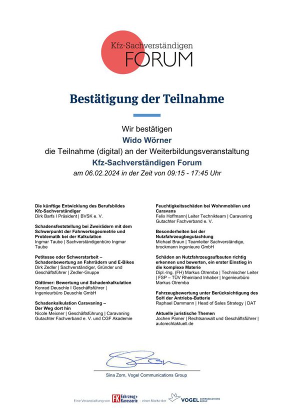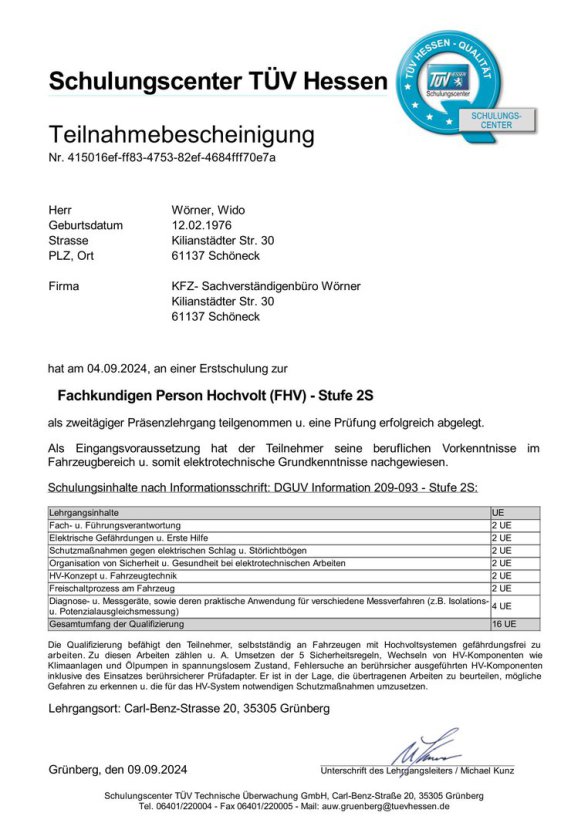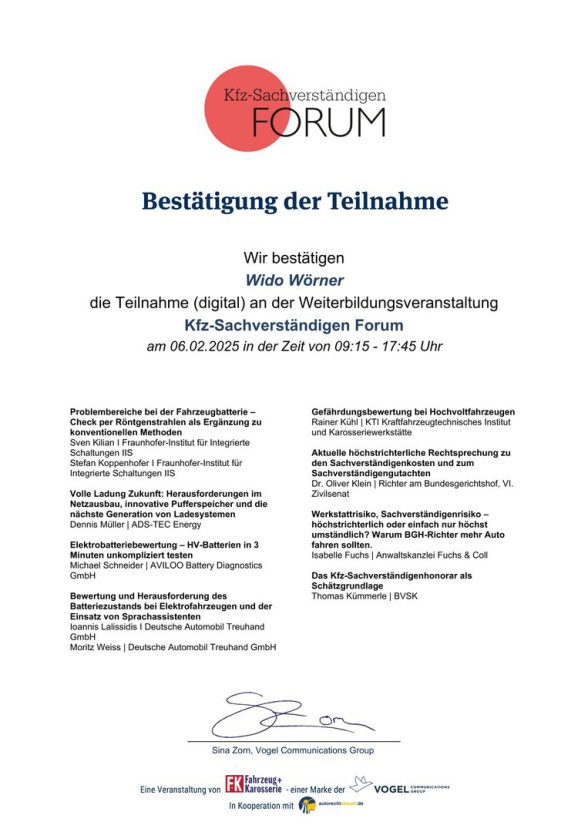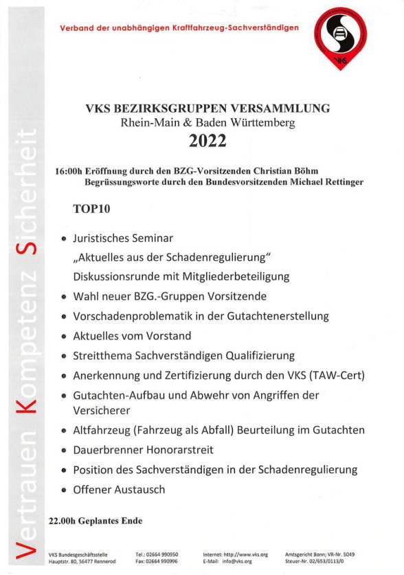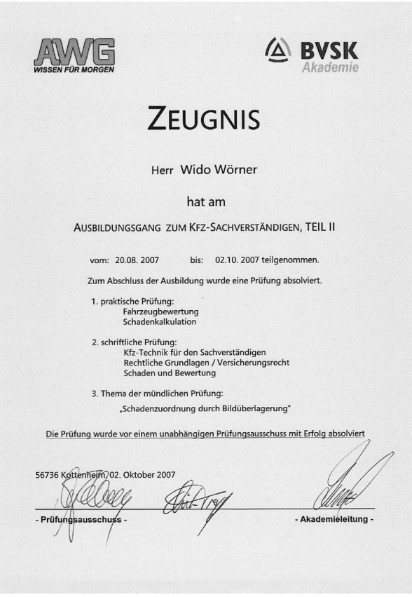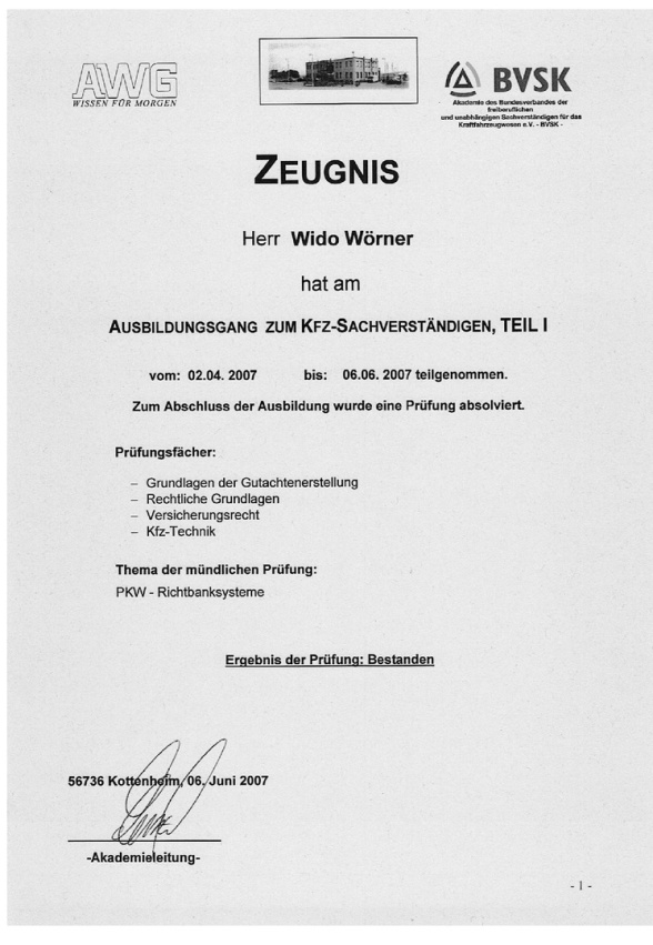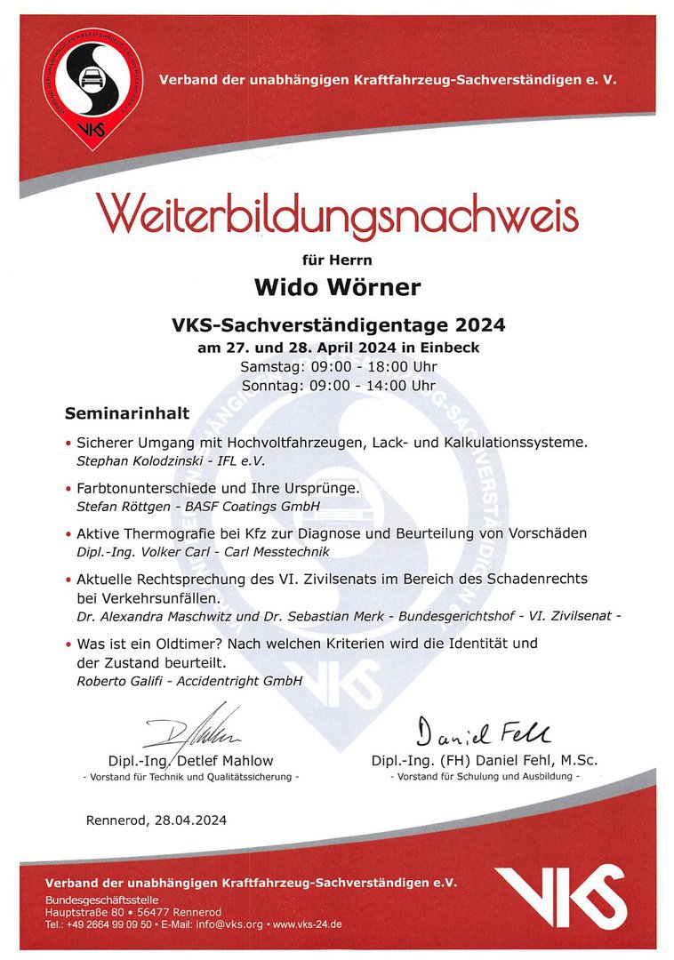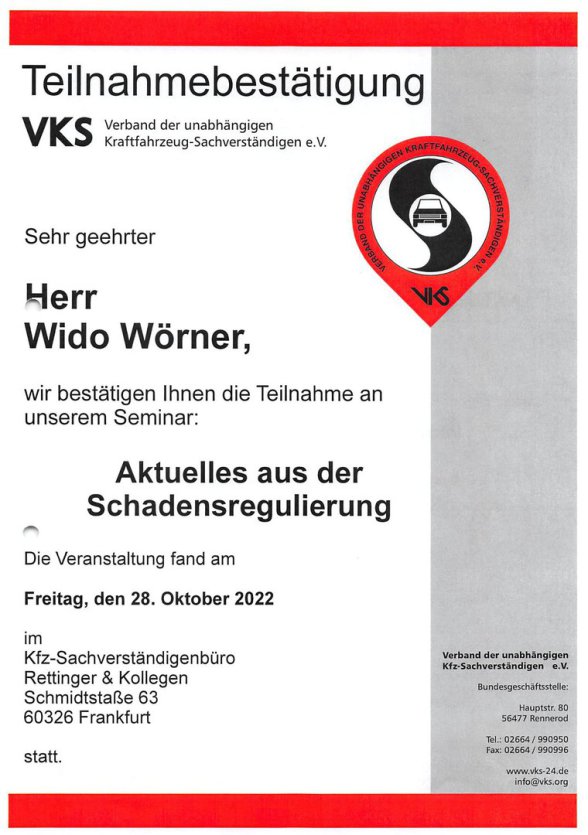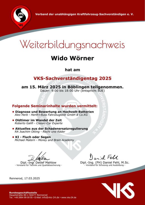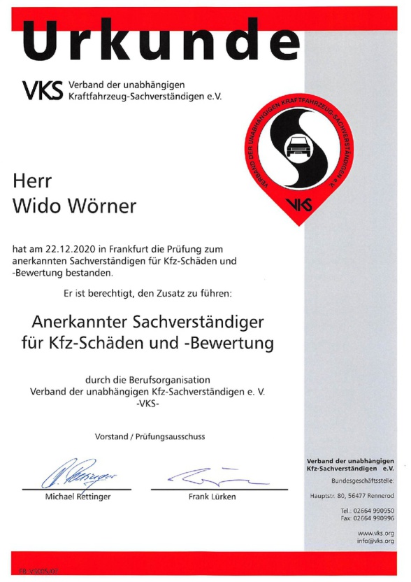 - Durch den Verband der unabhängigen Kfz-Sachverständigen e. V. (VKS) anerkannter