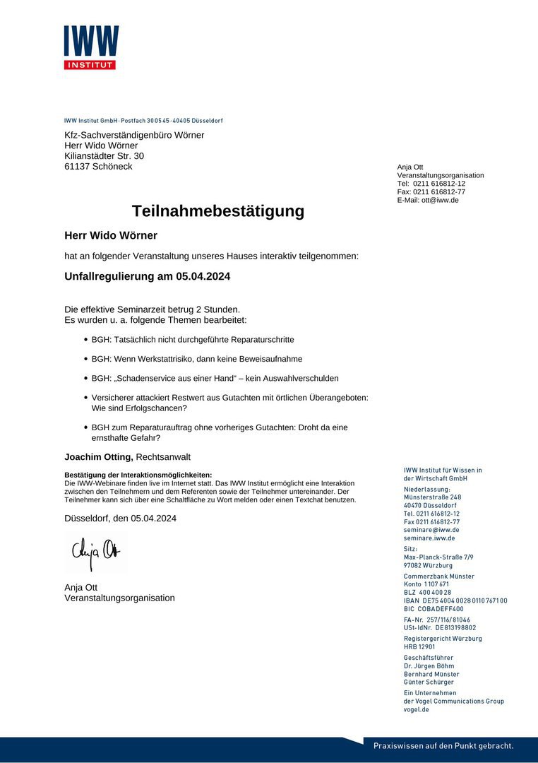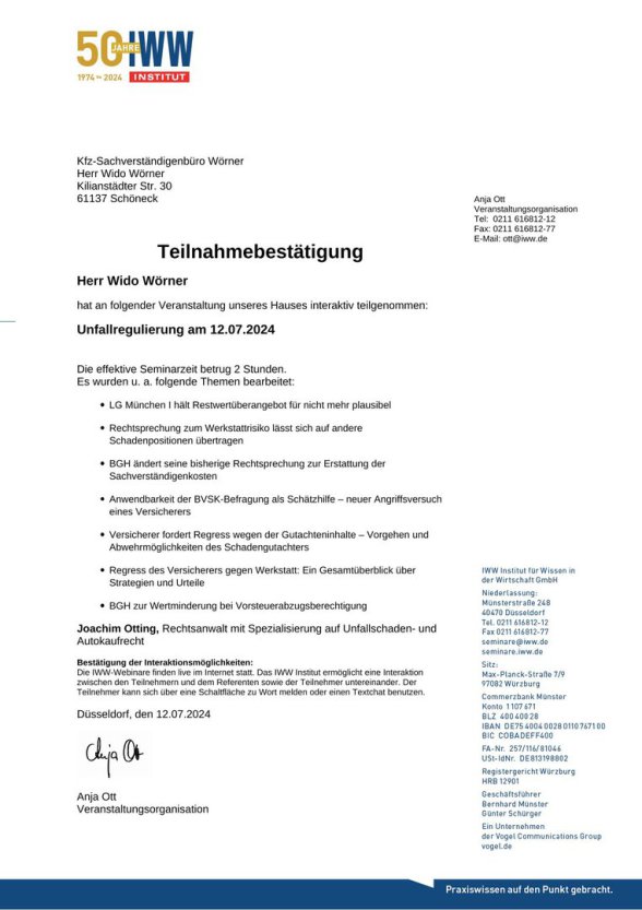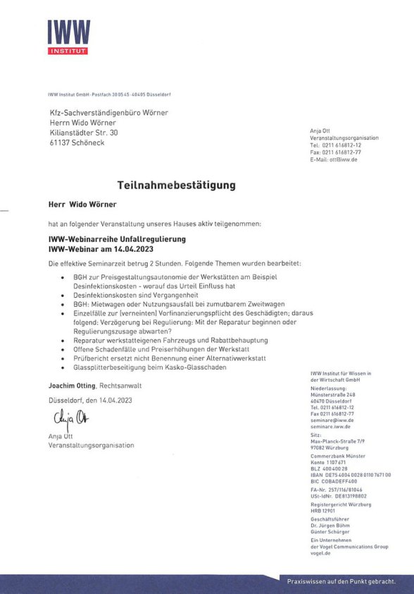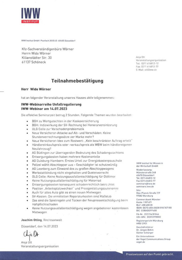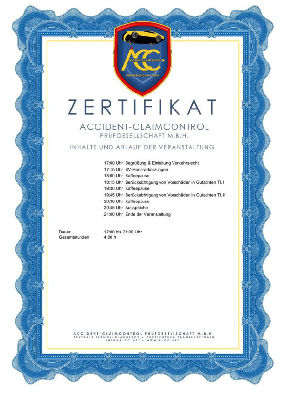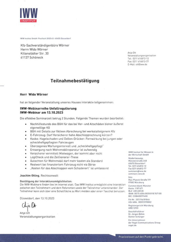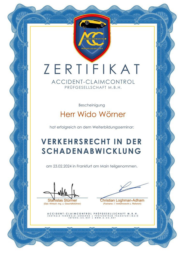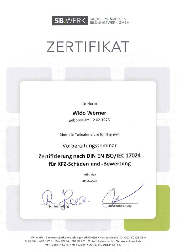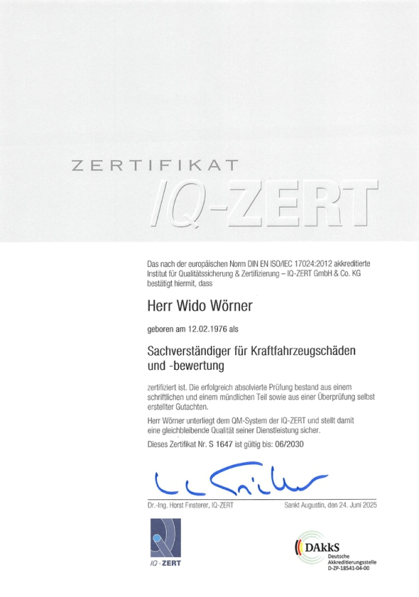 (IQ-Zert - DAkkS akkreditiert) zertifizierter Sachverständiger für Kfz-Schäden und -Bewertung, Zertifikats Nr. S 1647