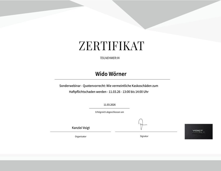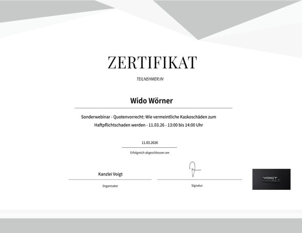 (IQ-Zert - DAkkS akkreditiert) zertifizierter Sachverständiger für Kfz-Schäden und -Bewertung, Zertifikats Nr. S 1647